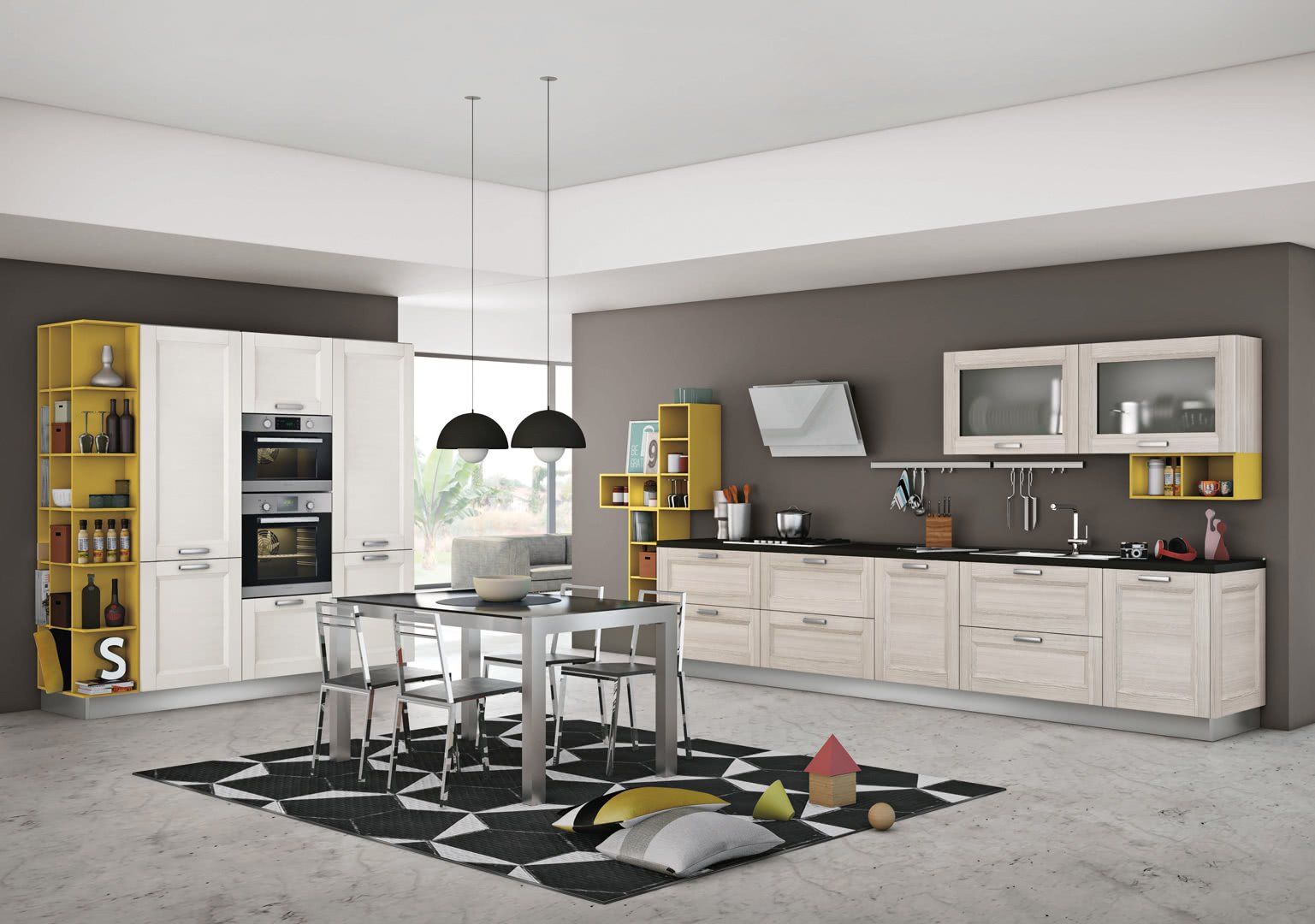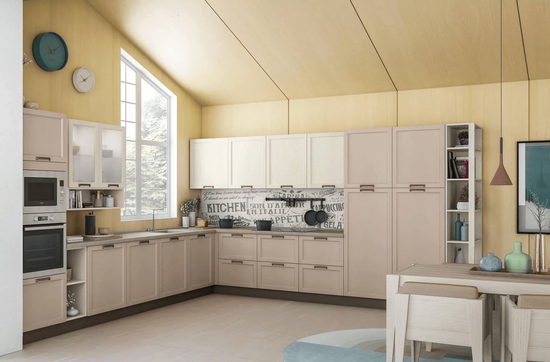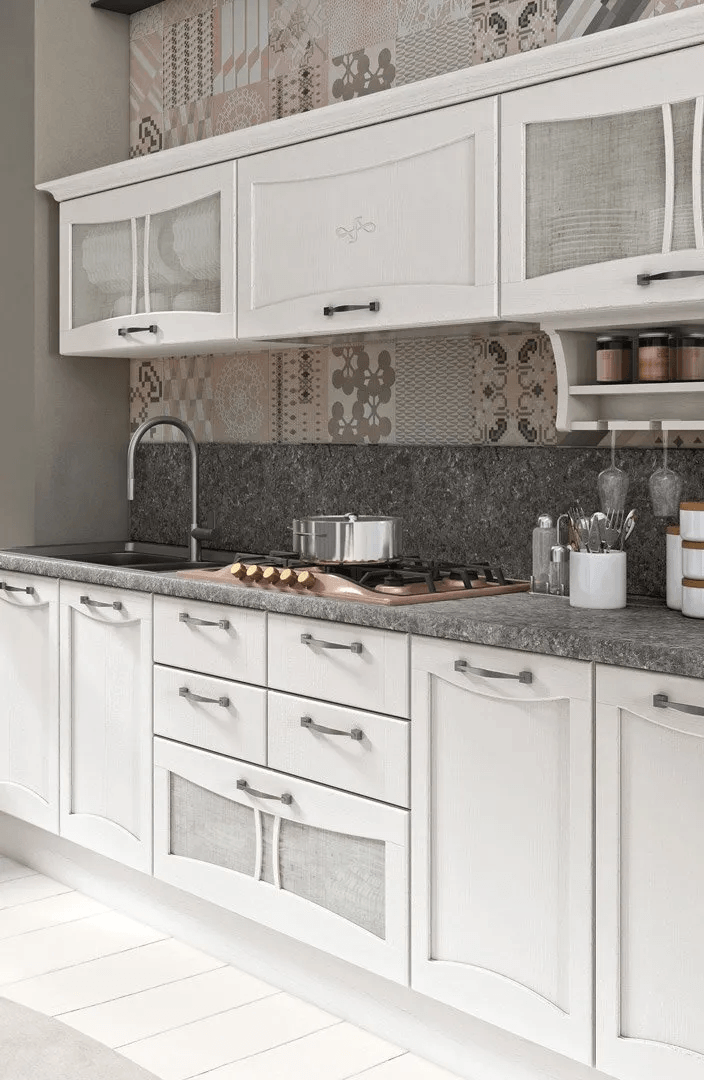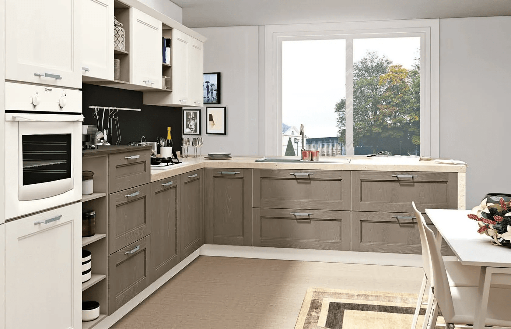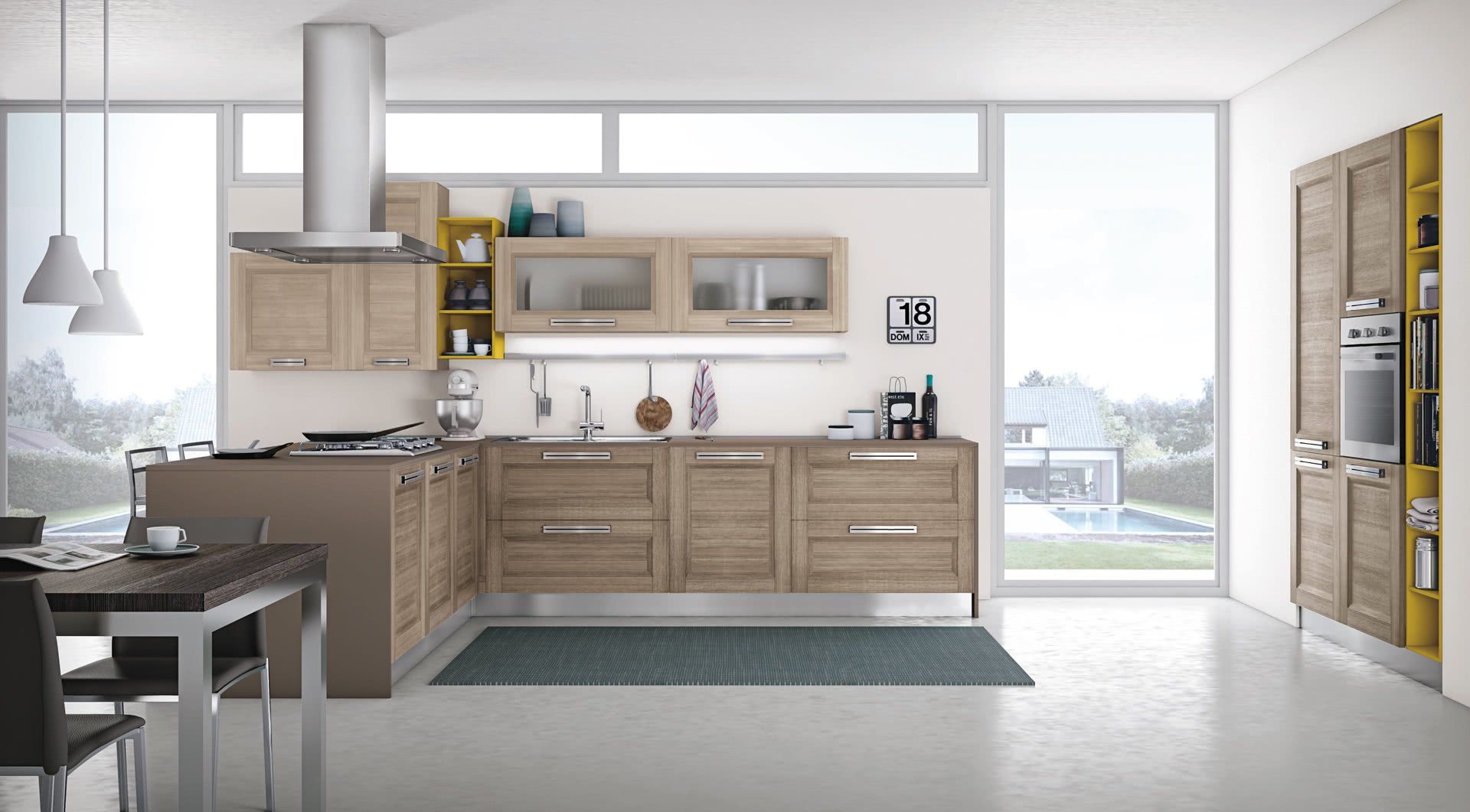 Uno sguardo alla tradizione, uno all’innovazione. Raila è tradizionale e insieme moderna, ti accoglie con calore e rende pratica ogni attività quotidiana in cucina. Qui le basi e le colonne hanno ante in frassino laccato grigio polvere a poro aperto, mentre i pensili hanno ante in frassino laccato bianco camelia.